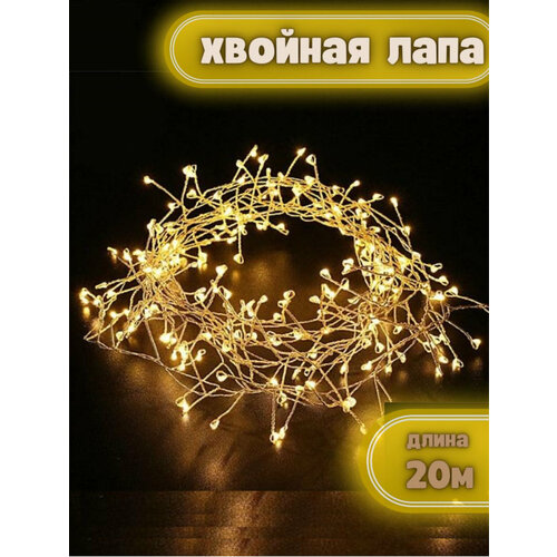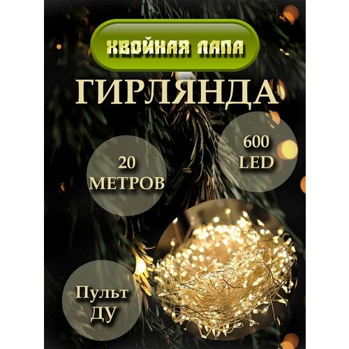 Гирлянда хвойная лапа роса 20 метров 8 режимов свечения с пультом / светодиодная бахрома / теплый свет.