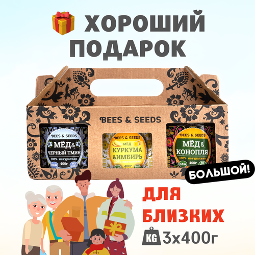 3в1: Мёд и Куркума, Чёрный Тмин, Семена - Подарочный набор на день учителя, папе и маме подарок на свадьбу, 3 по 400г