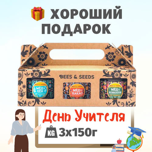3-в-1: Мёд и Лен, ШокоМёд, Мёд и Семена - Подарочный набор на день учителя, 3 по 150 г