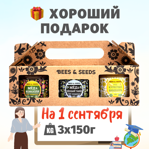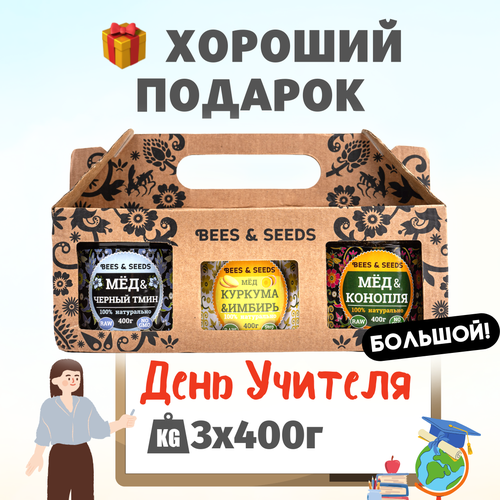 3в1: Мёд и Куркума, Семена, Чёрный тмин - Подарочный набор на день учителя для любого праздника (включая день рождения), 3 по 150 г