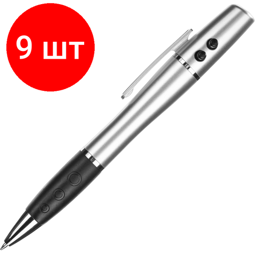 Комплект 9 штук, Указка лазер. ручка шарик. 3в1 серебр.+ красн. лазер+фонарь LH612СР син.