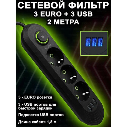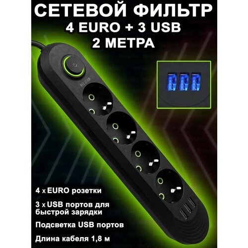 Сетевой фильтр, бытовой удлинитель с подсветкой USB-портов, длина 1.8 метра / Сетевой фильтр 1.8м. 4 розетки, 3 USB