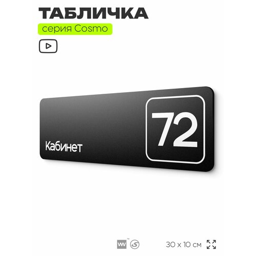 Табличка с номером кабинета "Кабинет №72", для офиса, 30 х 10 см, серия COSMO, черная, Айдентика Технолоджи