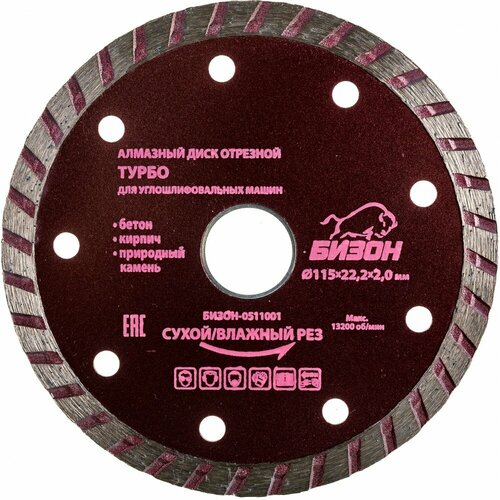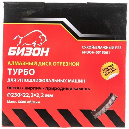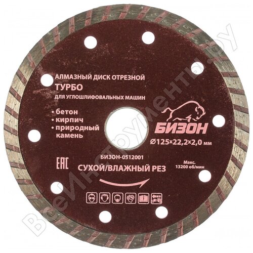 Бизон Диск алмазный отрезной 125*22,2*2,0мм, турбо, сухой/влажный рез, по бетону, кирпичу, камню, уп. картонная коробка БИЗОН-0512001