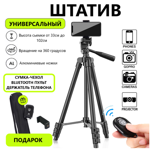 Штатив универсальный алюминиевый Black для фотоаппарата, телефона 33см-102см /Трипод /Тренога/ подарок - BLUETOOTH пульт, чехол, держатель