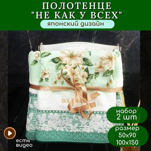 Набор махровых полотенец для ванной, банное большое и для лица и рук, BOLANGDE, 100% хлопок, Япония Жасмин 100х150 и 50х90, зеленый 2 штуки