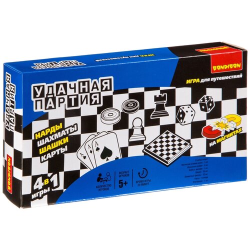 Набор игр 4 в 1 Bondibon Удачная партия, шашки, шахматы, нарды, карты ВВ0693 / Магнитная игра для путешествий