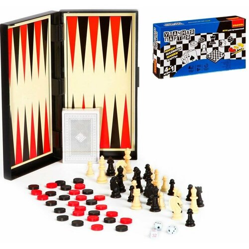 Набор настольных игр Bondibon Удачная партия 4 в 1 "Шашки, шахматы, нарды, карты"