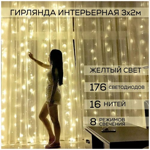 Новогодняя светодиодная гирлянда штора 3х2 м, желтый