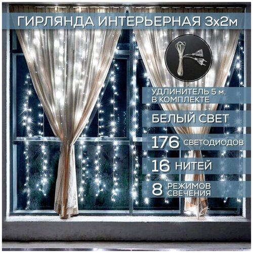Новогодняя светодиодная гирлянда штора 3х2 м, удлинитель в комплекте, белый