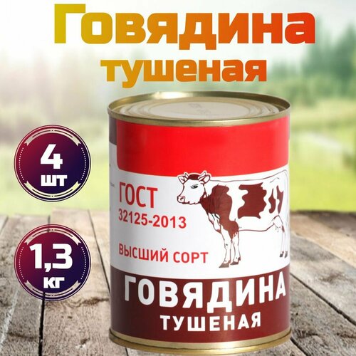 Тушенка говядина 4 шт-338гр, Высший Сорт ГОСТ , Говяжья, Консервы мясные