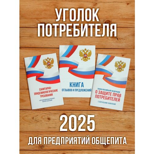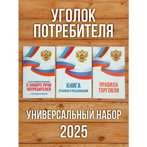 2025 Комплект из 3 книг для уголка потребителя "Универсальный". Книга отзывов и предложений. Закон о защите прав потребителей. Правила торговли. Бумажный барон