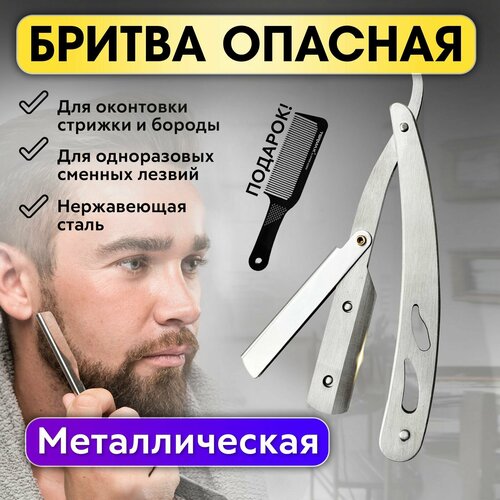 CHARITES / Опасная бритва для мужчин, для барберов, подарок для мужчины, металлическая серебро+ В подарок: Расческа для стрижки волос!