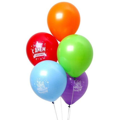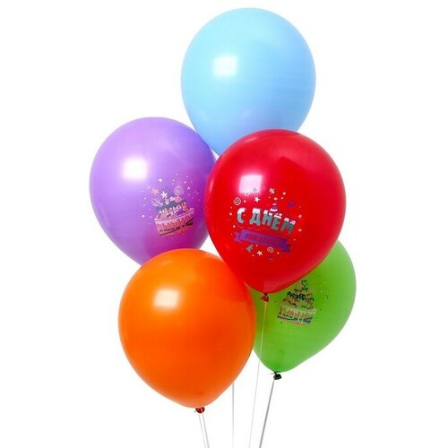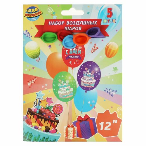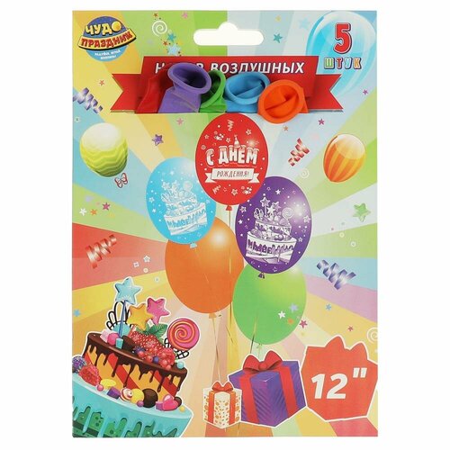 Чудо праздник Шар латексный 12" "С Днем Рождения" цветной принт, набор 5 шт.