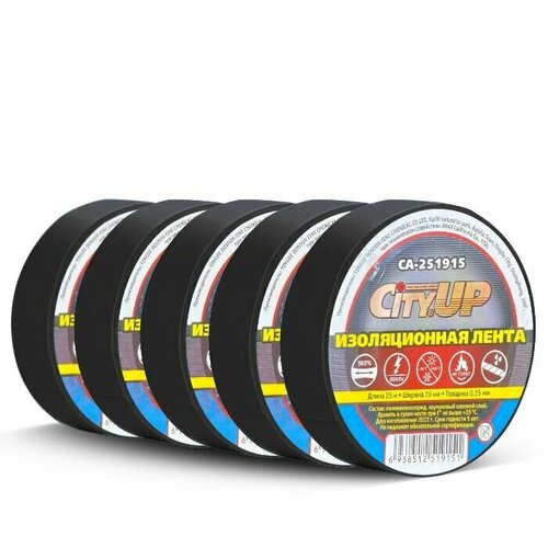 Изолента, изоляционная лента ПВХ, черная, 25 м х 19 мм, 5 шт