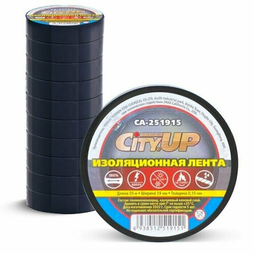 Изолента, изоляционная лента ПВХ, черная, 25 м х 19 мм, 10 шт