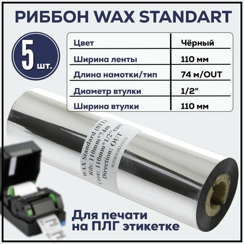 5 штук. Черный риббон WAX (110 мм x 74 м x 1/2" x 110 мм) OUT