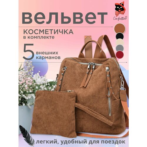 Сумка-рюкзак женский трансформер вельветовый стильный; Рюкзак вместительный городской повседневный для прогулок коричневый