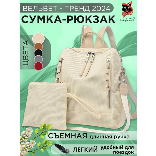 Сумка-рюкзак женский трансформер вельветовый стильный; Рюкзак вместительный городской повседневный для прогулок светлый