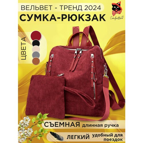 Сумка-рюкзак женский трансформер вельветовый стильный; Рюкзак вместительный городской повседневный для прогулок бордовый