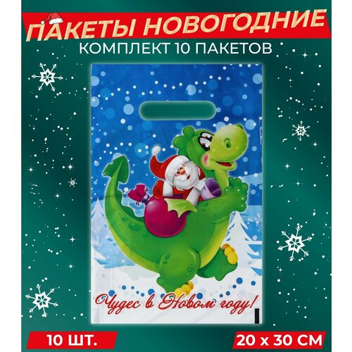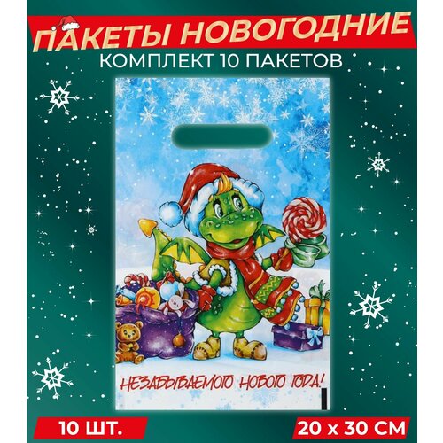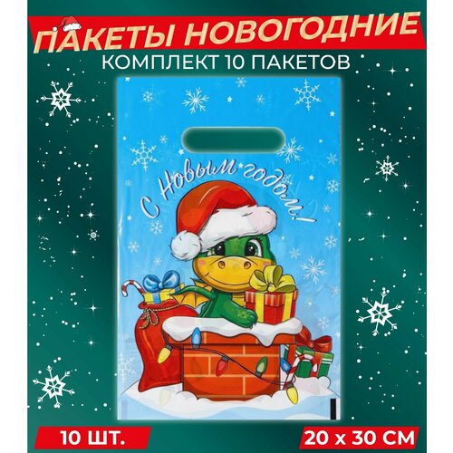Пакеты подарочные на Новый год 2024, год Дракона. В комплекте 10 штук, размер 20 на 30 сантиметров.