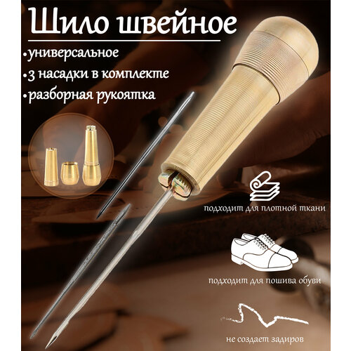 Шило швейное для одежды и обуви с тремя разными насадками, ручка медная разборная.