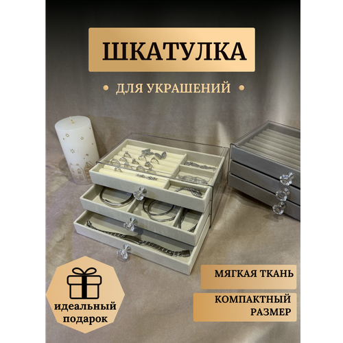 Шкатулка-органайзер для хранения ювелирных украшений и бижутерии, бархатная, три яруса, бежевая