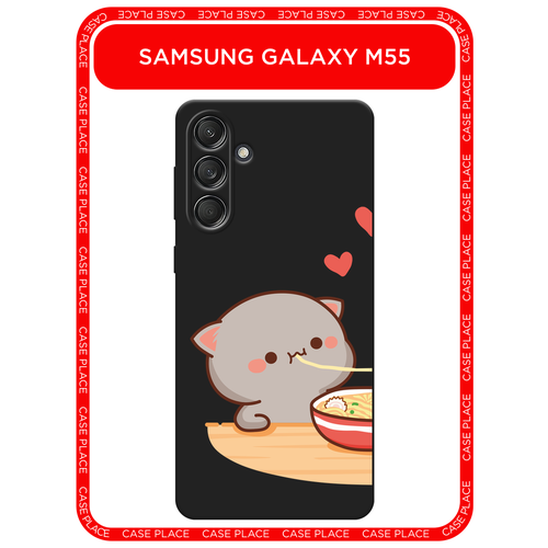 Черный матовый чехол на Samsung Galaxy M55 / Самсунг M55 с принтом Чёрный котик с лапшой