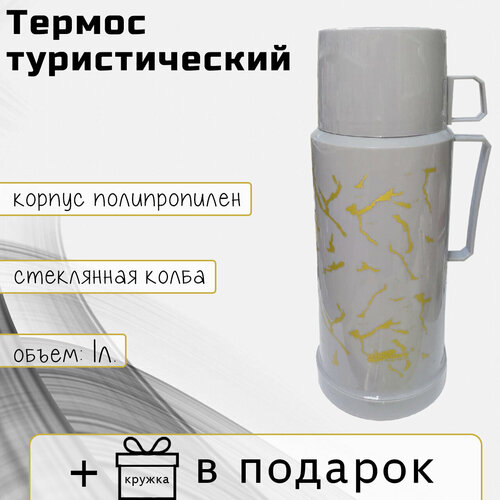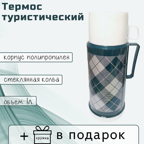Термос 1 л со стеклянной колбой, 2 чашки, сохраняет тепло 8 часов, 12 х 28 см + керамическая кружка в подарок!