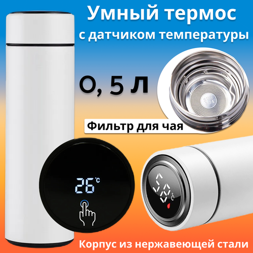 Умный термос 0,5 л с датчиком температуры и ситечком для чая / Белая термобутылка с LCD дисплеем индикатором / Термокружка металлическая / Автокружка
