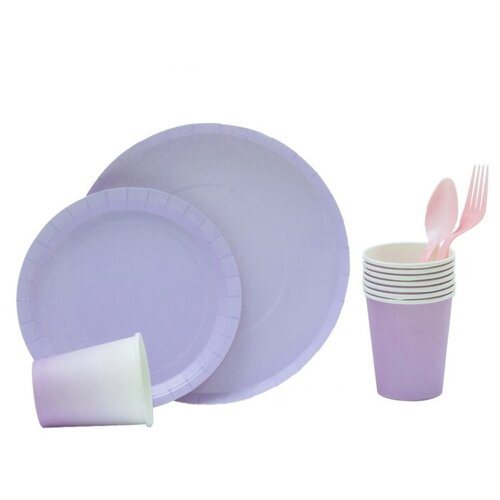 Набор одноразовых столовых принадлежностей на 8 персон, тарелки, стаканчики, ложки, вилки, цвет сиреневый, 23х23х11 см