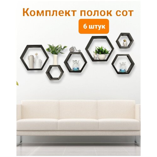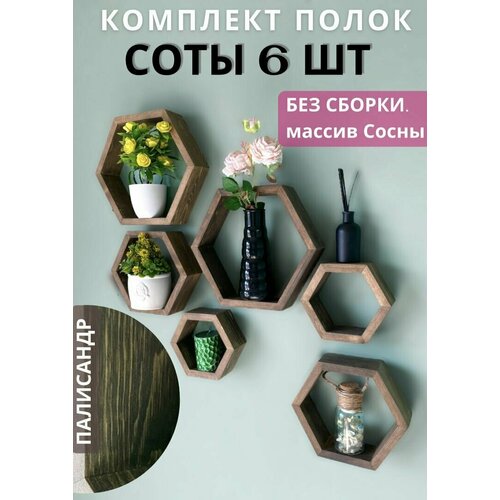Комплект полок соты деревянные Палисандр 6 шт, настенные интерьерные декоративные навесные полки на стену для декора в интерьере