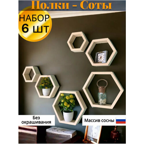 Комплект полок соты 6 шт массив сосны Натуральное дерево, Полка настенная навесная набор 6 шт, полка на стену