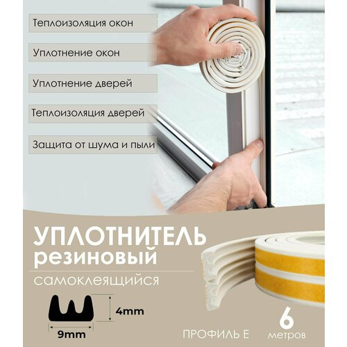 Уплотнитель резиновый самоклеящийся для окон и дверей, 4х9 мм (профиль Е), 6 метров - 2 рулона