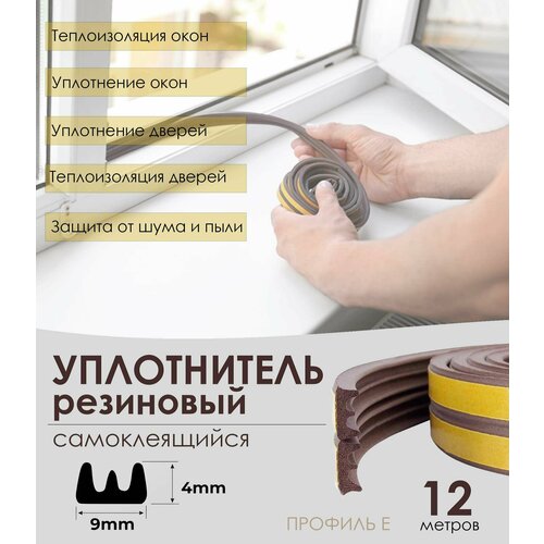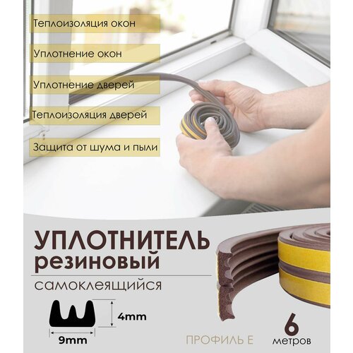 Уплотнитель резиновый самоклеящийся для окон и дверей, коричневый, 4х9 мм (профиль Е), 6 метров - 3 рулона