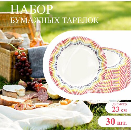 Набор тарелок бумажных, диаметр 23 см, с узором радуга - 30 шт. / набор одноразовой посуды, картонных тарелок