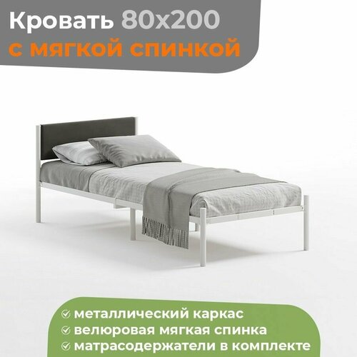 Кровать металлическая компактная 80х200 белая с темно-серой с мягкой спинкой