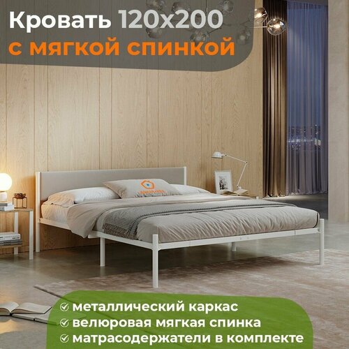 Кровать металлическая компактная 120х200 белая с бежевой с мягкой спинкой