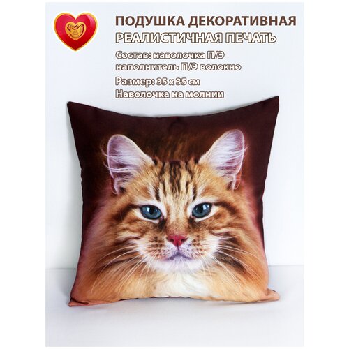Подушка декоративная на диван 35х35 в подарок с фотопечатью кот пушистый рыжий