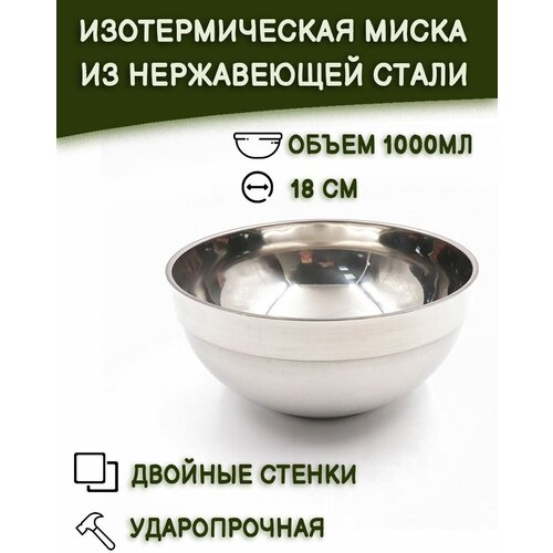 Изотермическая походная миска из ударопрочной пищевой нержавеющей стали, термомиска туристическая с двойными стенками 1000мл на рыбалку, в экспедицию