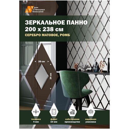 Зеркальная плитка ДСТ, панно на стену 200х238 см, цвет серебро матовое, форма ромб 20х34 см.