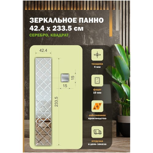 Зеркальная плитка ДСТ, панно на стену 42.4х233.5 см, цвет серебро, форма квадрат 15х15 см.