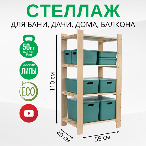 Стеллаж деревянный напольный для хранения 4 полки 55х40х110 см, этажерка из липы, DBM0042 ДваДома