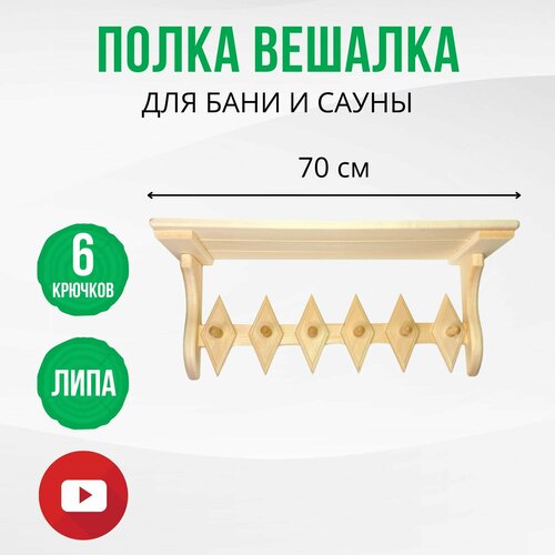 Полка вешалка для бани и сауны деревянная из липы 6 крючков большая, полка для бани настенная без покрытия DBA0025-6, ДваДома