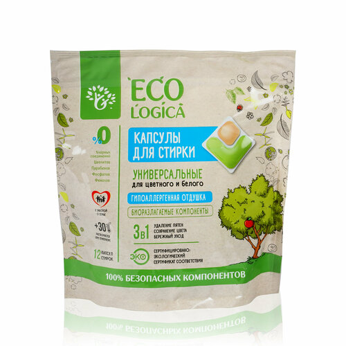 Универсальные капсулы для стирки Ecologica 3119842 для цветного и белого белья, 3в1, 12шт