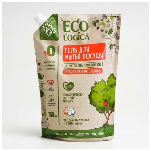 Ecologica Гель для мытья посуды "Ecologica", экстракт хлопка и семян льна, дойпак, 750 мл