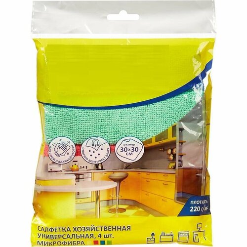 Салфетка хозяйственная из микрофибры универсальная, 30х30см, 220 г/м², 12 штук в наборе, цвет: синий/зеленый/желтый/красный