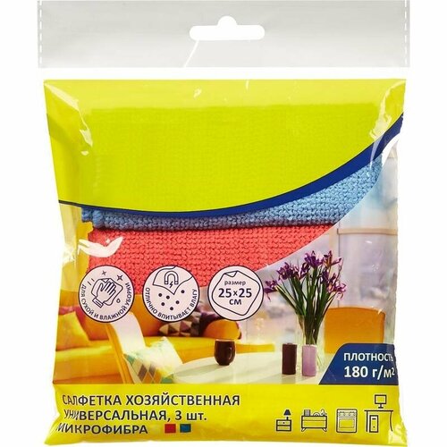 Салфетка хозяйственная из микрофибры универсальная, 25х25см, 12 штук в наборе, цвет: синий/красный/желтый