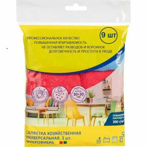 Салфетка хозяйственная из микрофибры универсальная, 30х30см, повышенная плотность 300 г/м², 9 штук в наборе, цвет: синий/красный/желтый