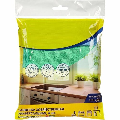 Салфетка хозяйственная из микрофибры универсальная, 30х30см, 180 г/м², 12 штук в наборе, цвет: синий/зеленый/желтый/красный